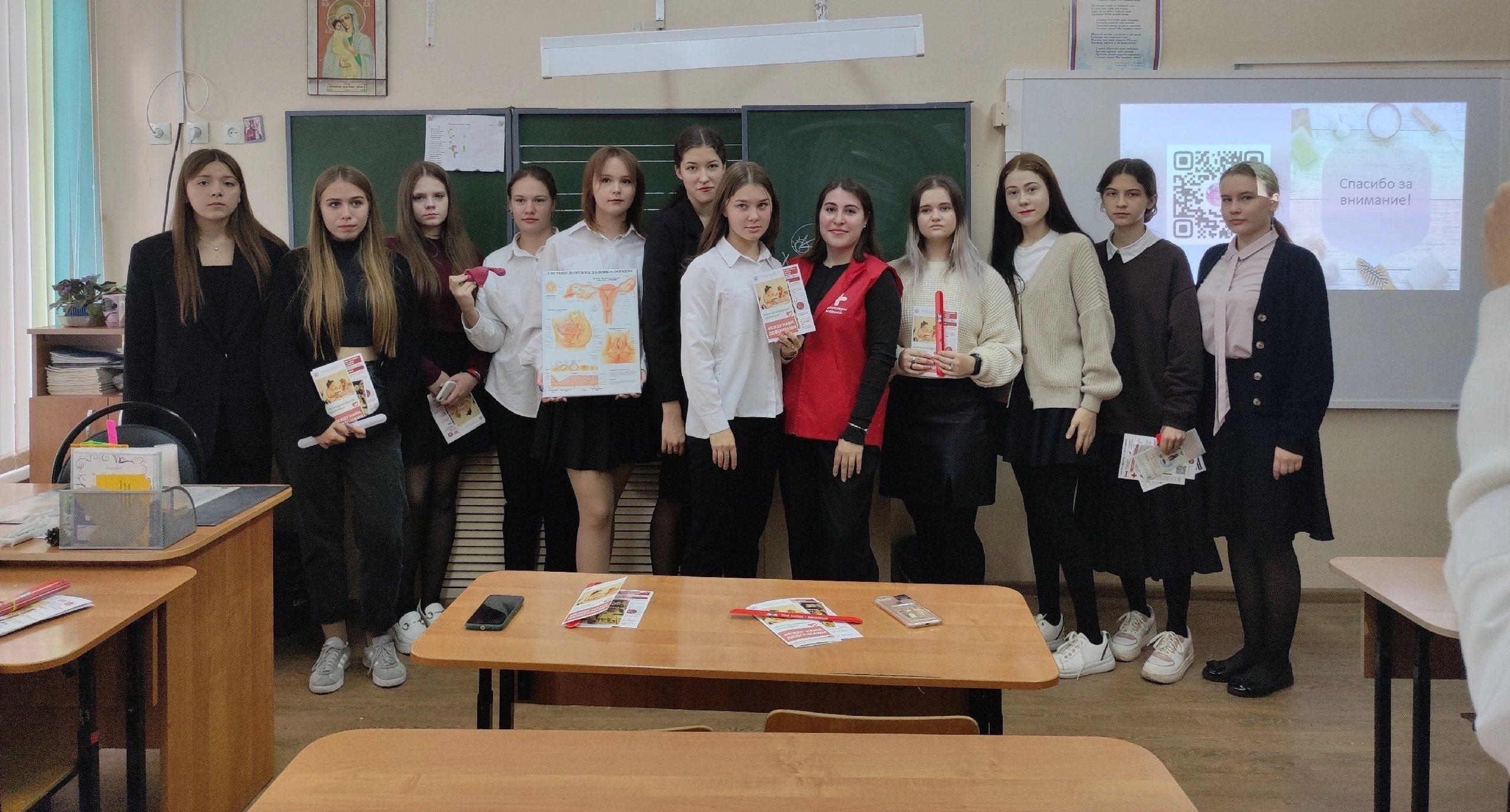 Также волонтер-медик рассказала, как вредные привычки влияют на репродуктивную систему. Школьницы детально рассмотрели строение женской репродуктивной системы, а также задали вопросы по физиологии, касающиеся менструального цикла. В лекции приняли участие 20 школьниц.