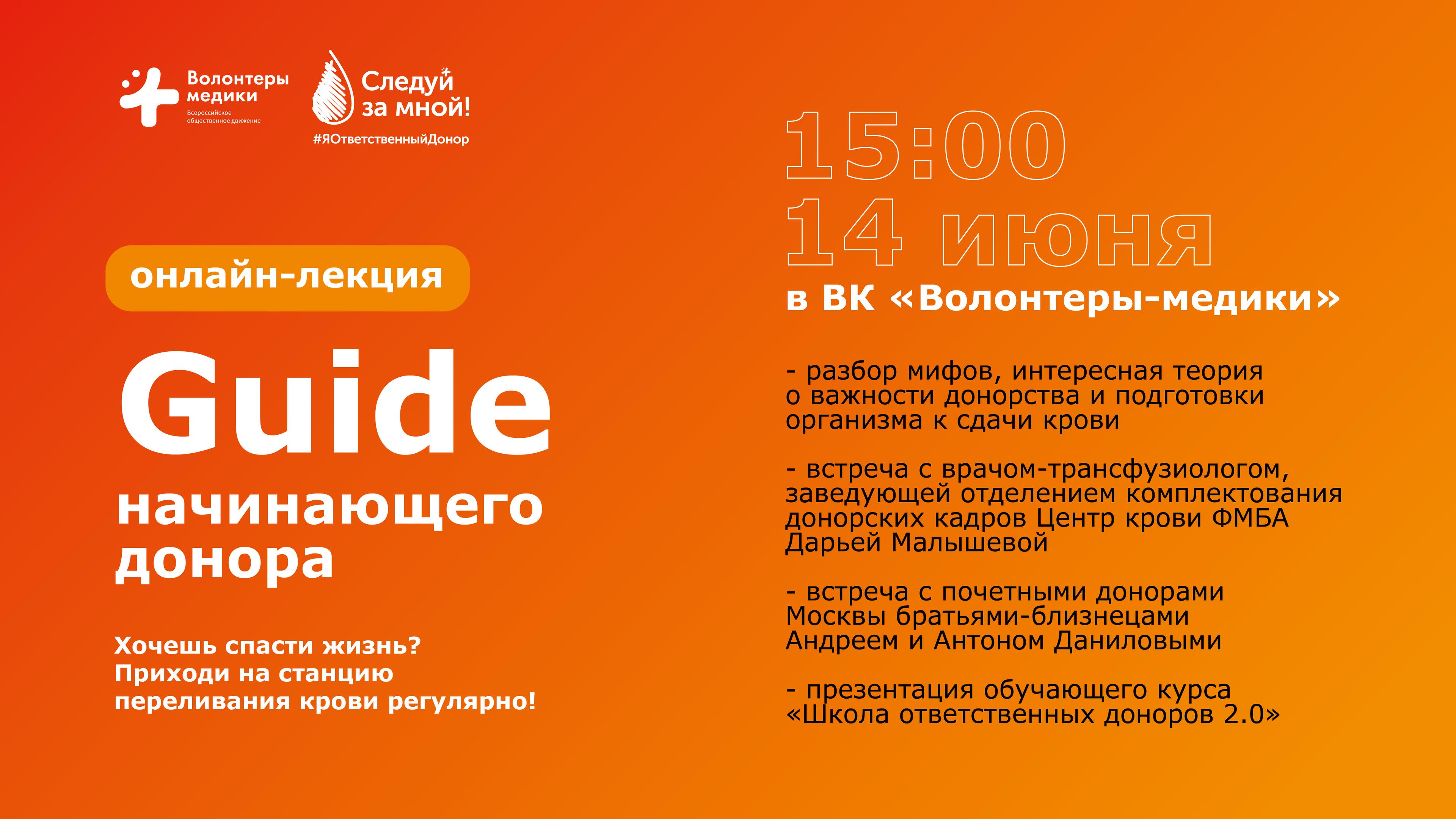 В воскресенье в 15:00, 14 июня, во Всемирный день донора крови в группе ВКонтакте «Волонтеры-медики» пройдет онлайн-лекция «Guide начинающего донора», в рамках которой эксперты и медики расскажут о донации крови и презентуют обучающий курс «Школа ответственных доноров 2.0».